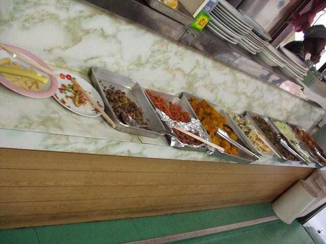 店はいわゆる「めし屋」風情でとても素朴な雰囲気。メニューはどれも安価だが、10種類近く並んだ惣菜+ご飯・おかゆ・スープが食べ放題で