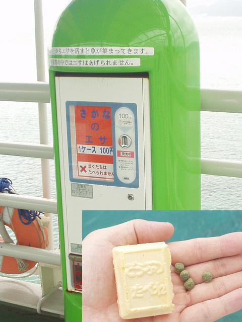 桟橋から10mほど下の海面を覗き込むとそこでも魚の姿が見え、エサが販売されているので早速ためしてみに購入。