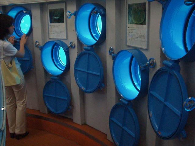 急な螺旋階段を海底まで降りると、船の窓のような丸窓がいくつもあり、そこから海中を眺めることができる。透明度満点とはいかないが、