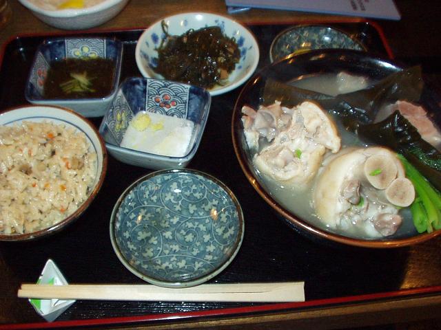 「てびち汁」の夕食。昼のそば&バーガーがこたえたのか、大きな豚足が2本もゴロッと入っているとさすがに完食とはいかなかず、