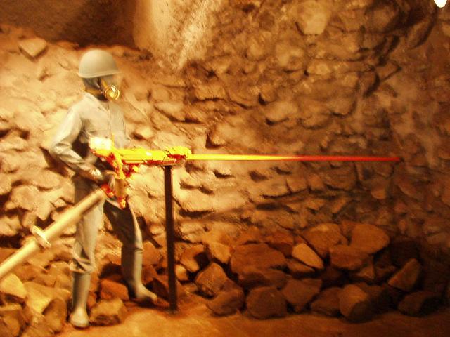約9分で「体験坑道駅」に到着。ガイドさんに従って坑内を進むと「手作業」が多かった工事の様子が実機で再現されており、
