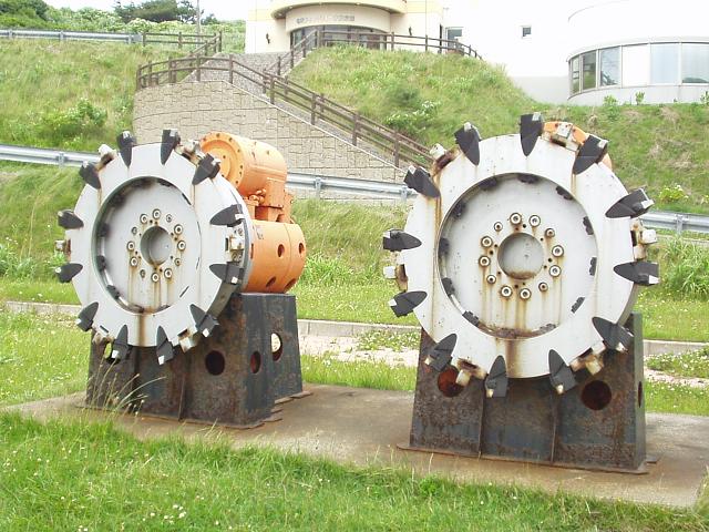 本州側の「基地」です、斜面に「龍飛」の文字、実際に使われた工作機械、青函トンネル記念館