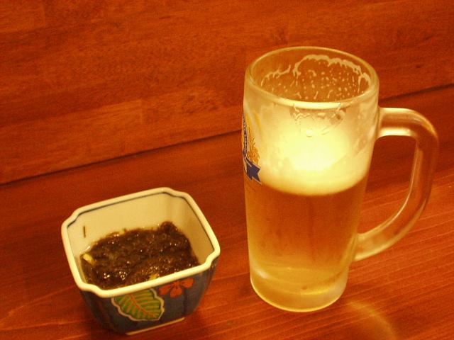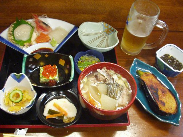 付出しのもずくでビールを堪能していると、刺身から始まってほや、海草、茄子田楽、かぶのがっくら漬、名物じゃっぱ汁、そして仕上げは