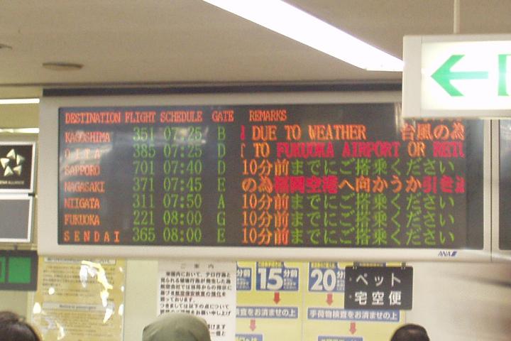 空港に着くと、欠航の表示はないものの、さすがに「悪天候のため、福岡に行くか、引き返すかもしれない」の表示。旅の目的のひとつが