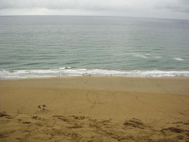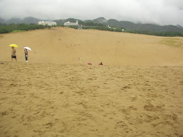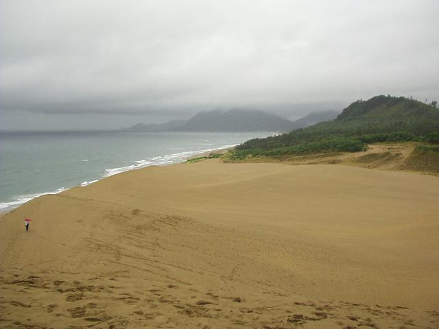 それでも海岸まではかなり距離がある。裸足になって、小高い「馬の背」を目指す。あいにくの雨だが、水を含んだお陰で砂は固くなり