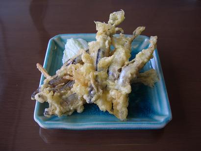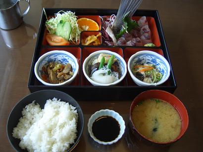 観光センターで昼食、きびなごの天麩羅、トビウオの刺身定食