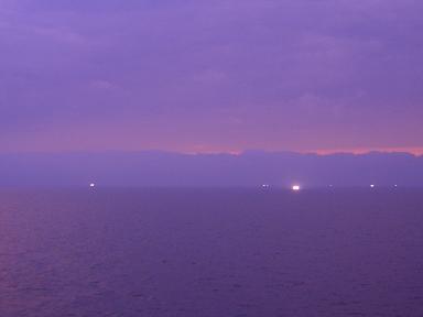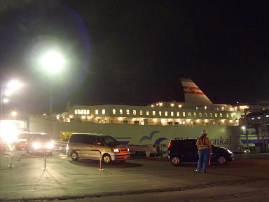 お疲れの船内、夕焼けと漁火、小樽に着きました