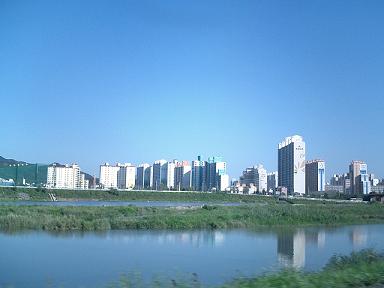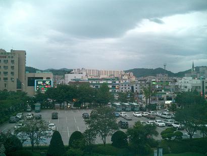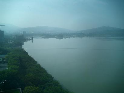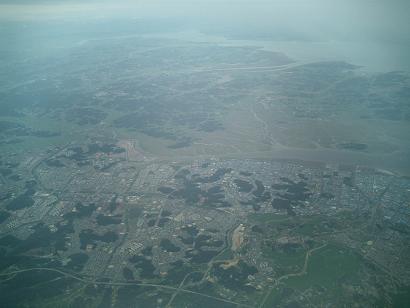 上空から見た韓国、牙山(Asan)の町並み(読めません)、ホテルの部屋から