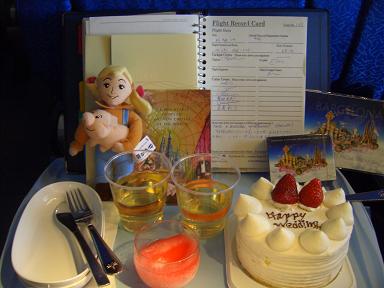 S’pore経由なのでSQ、ハネムーナーへのケーキサービス(^^、フィリピン上空