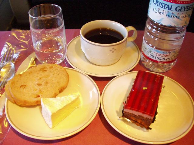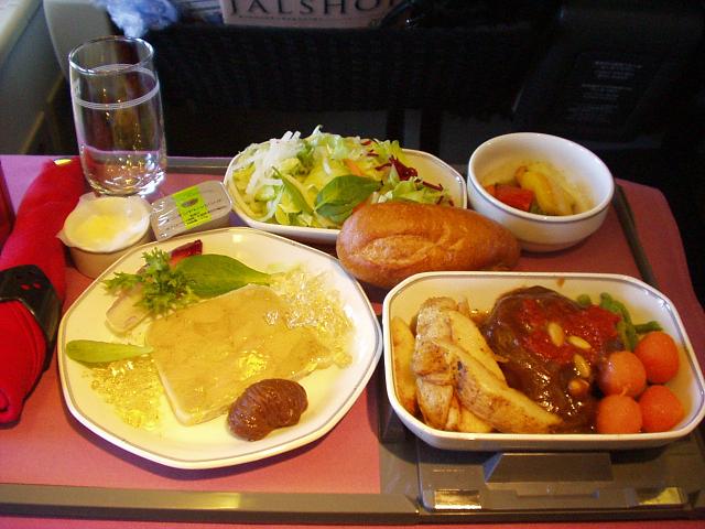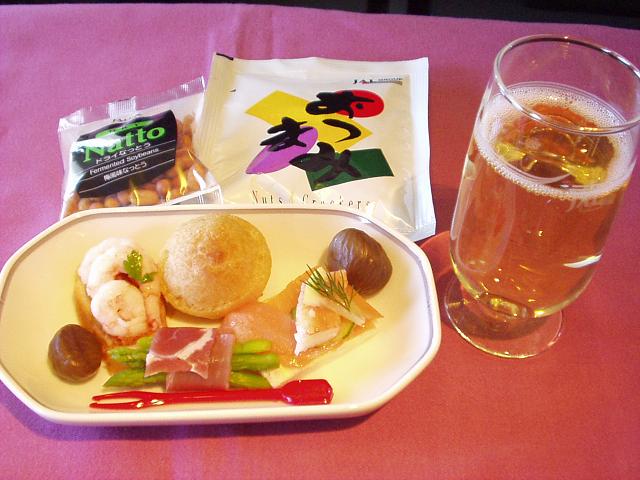 2度目のJAL国際線ビジネスクラス。前菜に始まって、毎度?の フォアグラのテリーヌ。他はともかくまたこれが味わえたことは嬉しかった。 |