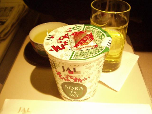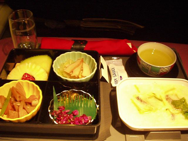 約13時間のフライトでは昼食・夜食、そして到着3時間ほど前に、 朝食がサービスされる。夜食はやはり「〜ですかい」シリーズ。今回はそば。 朝食は洋食があまり魅力的に思えなかったので、和食をチョイス。 魚の載ったおかゆは胃にも優しく、なかなか美味しかった。 |