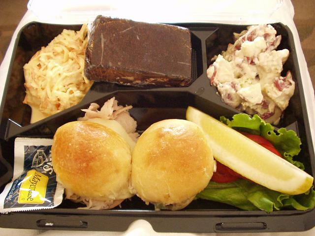 これは正確に言えば私の勤務する会社が用意したものだが、 機内でサービスされたということで機内食の範疇に入れることにした。 ハムサンド、パスタ、ポテトサラダにチョコケーキがつくという 会社が用意するにしては豪勢なランチボックスだった。 |