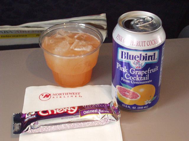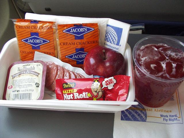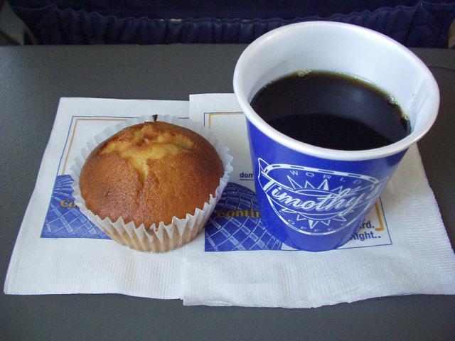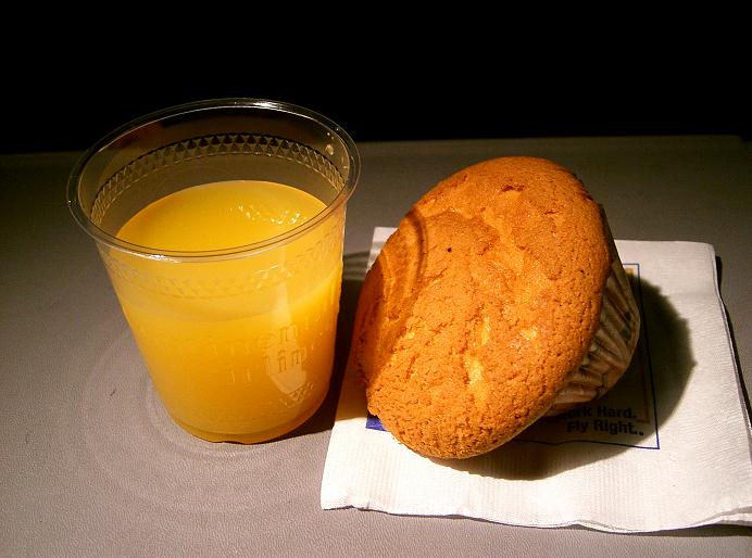 モントレー−ヒューストン便では往路と同じボックススナックがサービスされた。 しかしその飛行機の遅れのために乗り継ぎできずヒューストンで一泊するハメに。 翌朝のシンシナティ便では朝食にマフィンがサービスされた。 |