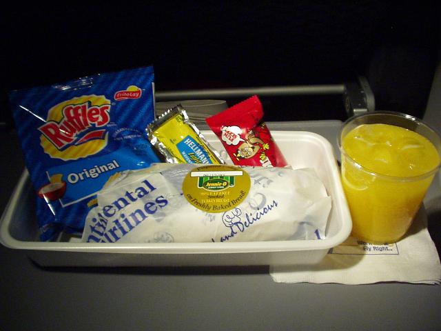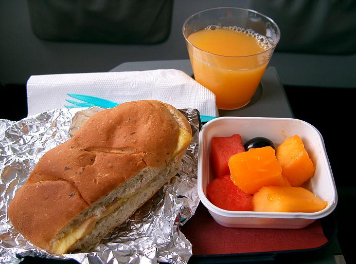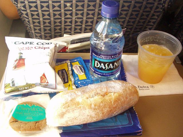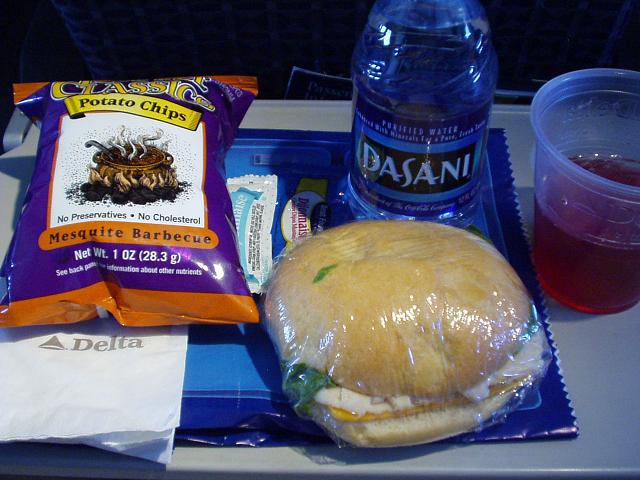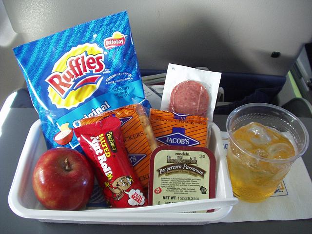 所要4時間超のアメリカ中東部−西海岸路線では、さすがに食事がサービスされた。 紙袋をバサッと配るだけ、味もよくないというのはいかにもアメリカのエアラインらしいが、 それでもサービスがあるだけましと思うべきか・・・ |