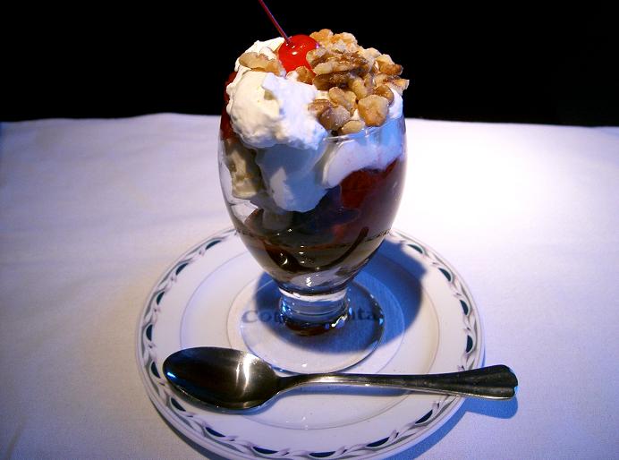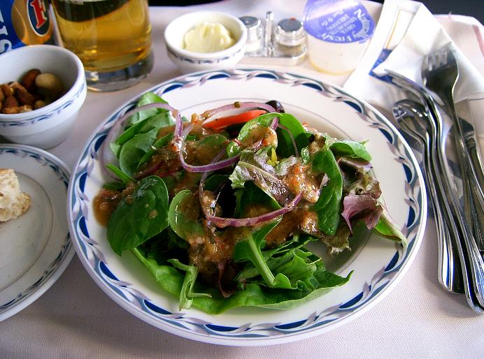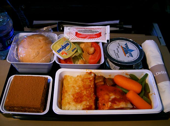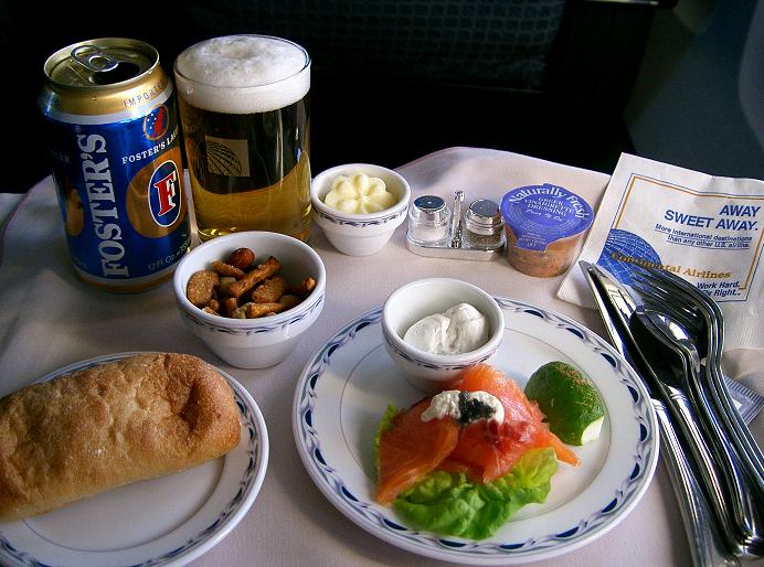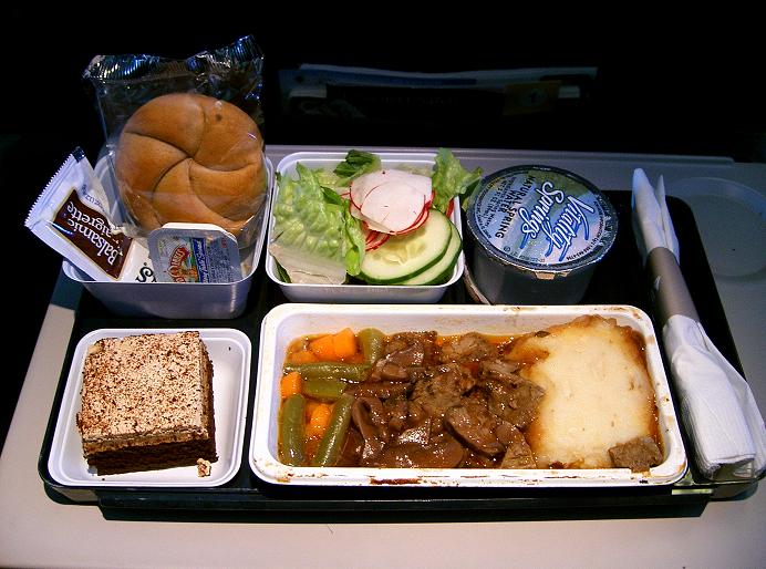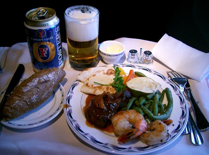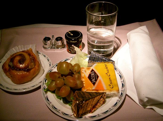 オーバーブッキングのため、「ボランティア」で1日移動が遅れることに。 その見返りにビジネスクラスへのアップグレードを受けることができた。 さすがに8時間を越えるフライトのため食事も2回サービスされた。 メインのミックスグリルはアメリカにしてはなかなかの味。 デザートのてんこ盛りには閉口したが。 |