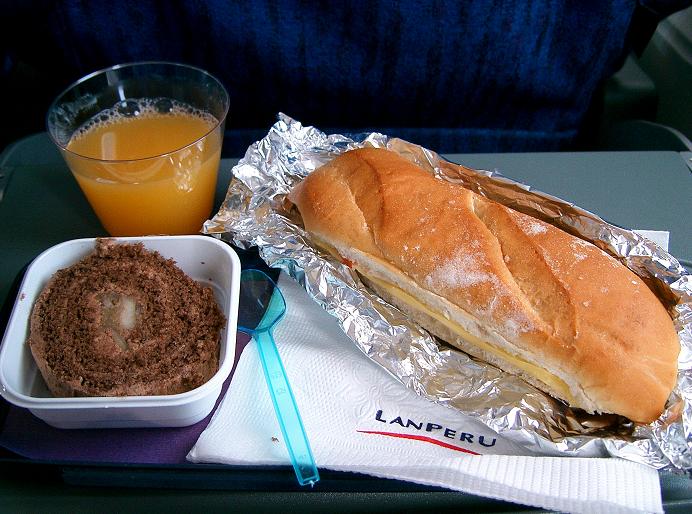 このラン・ペルー航空というのは驚きのエアライナーである。 ペルー国内のため安い料金設定、しかも1時間足らずのフライトにもかかわらず、 しっかり温められたサンドイッチが往路復路ともにサービスされるのだ! コストダウンばかり追及する日本のエアライナーにも見習ってほしいものである。 |
