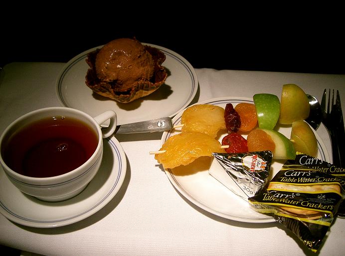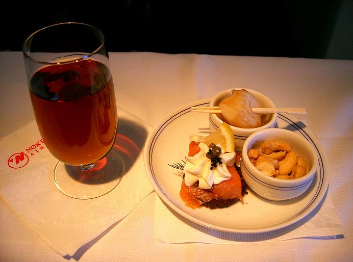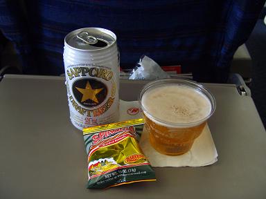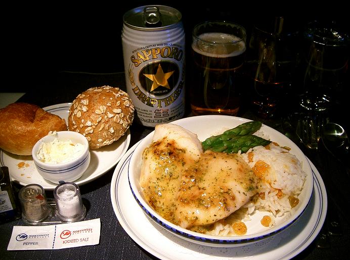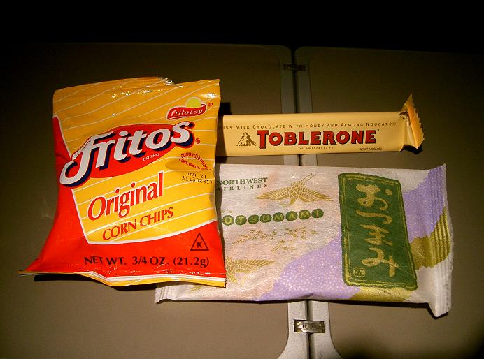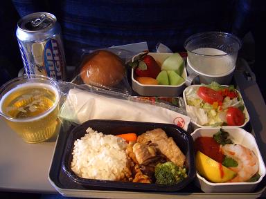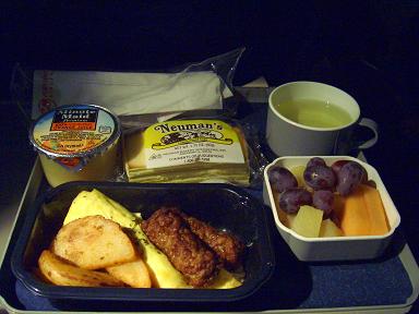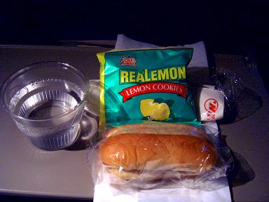 シートが狭いことで有名なノースウェストもエコノミーの食事は 何とか食べられるレベルで一応楽しみになった。 夜中のリフレッシュメントも、いかにも”アメリカ”らしいが意外とまともである。 |
