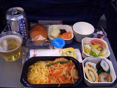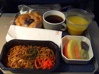 ビジネスクラスの食事を酷評させて頂いたノースウェストだが、 意外なことにエコノミーが割とまともだった。無論、もともとのレベルそのものは低いが、 ビジネスと比べると格段にコストパフォーマンスは高かった。 機内食は全て試すことをモットーにしているが、夜中のリフレッシュメントを 寝ていて逃してしまったのが悔やまれる。 ヤラレタのが朝食の”アジア風フライドヌードル” 何のことはない屋台の焼きそばだった。 (確かに日本のものでも”アジア風”には違いないが・・・) |