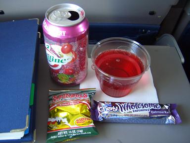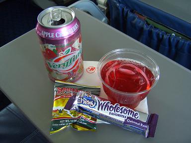 永遠に変わらないのではと思われるアメリカのエアラインのプレッツェル。 意地になって付き合っているが唯一楽しみなのがこのクランベリーアップルジュース。 やや甘く、1時間のフライトで350mlを全部飲むのはいささかキツイが楽しみな味である。 たまに出てくるオートミールバーも意外とイケる。 |