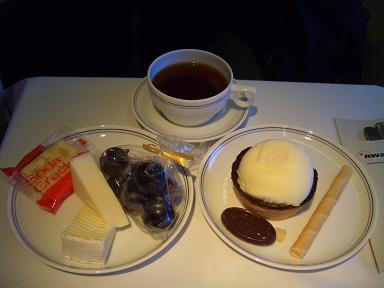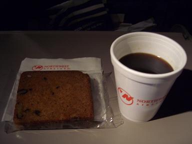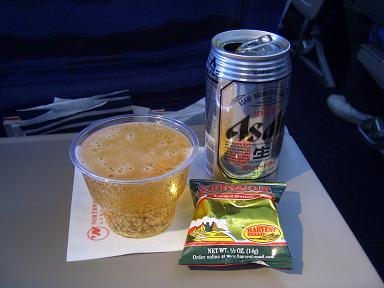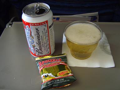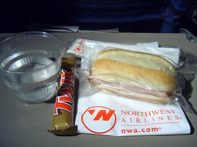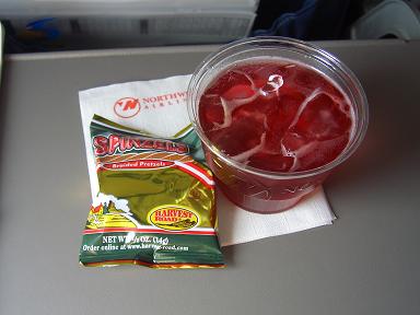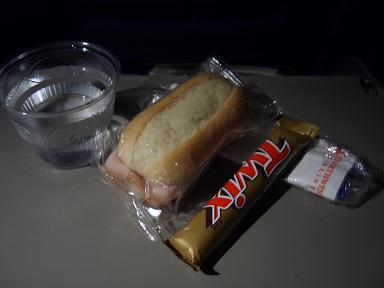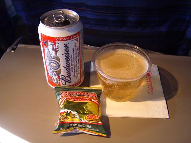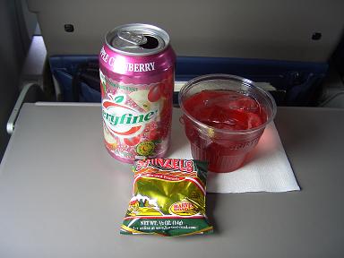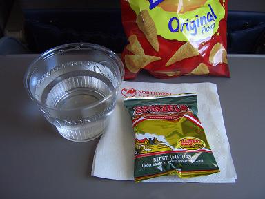 どういう基準化わからないがアメリカのエアラインのサービスは時々手抜きをする。 普通、ジュース、コーヒー等のドリンクをサービスするが、たまに水だけが配られる。 別にジュース一杯で文句言うつもりはないが、普段飲めない「クランベリーアップル」を 楽しみにしている身としてはちょっとがっかりである。 (復路の奥の菓子は持参品) |