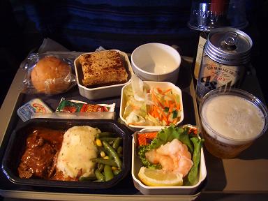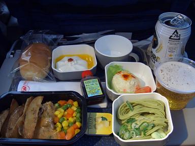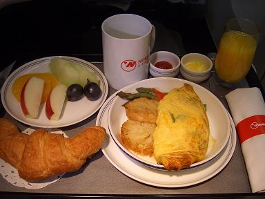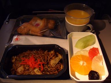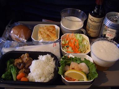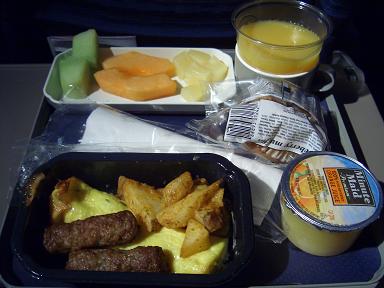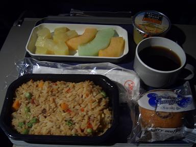 もう飽きたというか慣れたこの食事パターン。 それでもこれで当面さよならと思うとしっかり食べてしまうもの。 しかし朝食のフライドライスは失敗した。アメリカのエアラインなのだから 米は当然炊きすぎのボソボソ。ここにきてそれに気付けなかった自分が悔しかった・・・ |