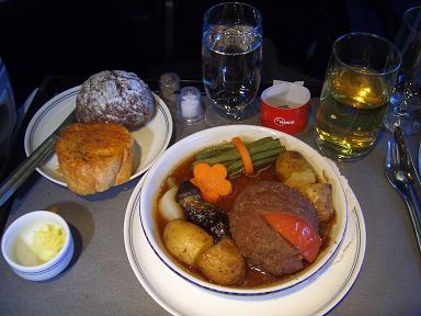 3度目の正直、やっとビジネスクラスへのアップグレードができ、 念願だったシェルフラットシートに座ることができた。 ビジネスの食事も少しは改善されたか?と期待したが、 結果は大して変わらず。唯一よかったのはオードブルのみ・・・ |