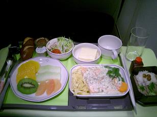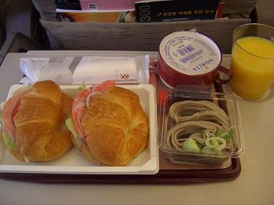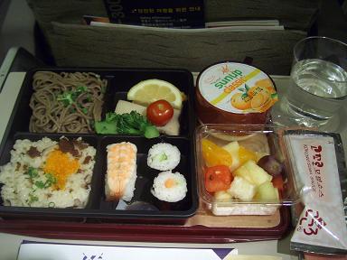 前回韓国線で、フライトタイムに関わらず国際線ではミールがサーブされることを覚え 今回も割と期待していたが、期待通りきちんとサービスされた。 天津−ソウル線で辛酸を舐めたアシアナだったが、 日本線は違うのかそば・寿司が出たり、味もきちんとしたものだった。 |