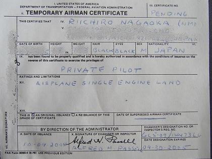 アメリカで過ごした 2003年の1年間、飛行機好きが高じて、 小型飛行機(平たく言えばセスナ)の免許取得に挑戦しました。 1年間の滞在中には完了できなかったため、その後の連休を使って 3回渡米、ついにプライベート・パイロットのライセンスを取得しました! |