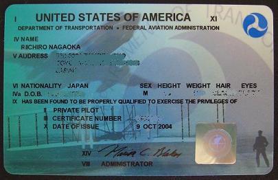 "小型飛行機免許"って? 〜よく聞かれる質問にお答えして〜 私が取得したのは「米国連邦航空局の自家用陸上単発航空機免許」です。 噛み砕くと、@アメリカで A200馬力以下エンジン1個の B自家用(商業用でない) C陸上機(水上機でない) である飛行機が操縦できるというもの。 簡単に言えば、2〜4人乗りセスナと理解して頂いて大きな間違いはありません。 この免許があれば、社会的・道義的問題は除くとして、管制塔がOKとさえ言えば、 ニューヨークのJFケネディ空港であれ世界一忙しいシカゴのオヘア空港であれ 離着陸できます。自分でグランドキャニオン遊覧飛行もできますし、 もちろんハワイ・グアムで飛ぶことも可能です。 要件は、@3年に1度の身体検査をクリアし、A飛行場で機体をレンタルして、 B3ヶ月以上飛んでないと必要になるレビューフライト(インストラクターと離着陸訓練を 3回以上すること)を行えば、アメリカ国内はいつでもどこでも自由に飛ぶことが出来ます。 ただし、国際免許ではないので日本で飛ぶには書き換えが必要です。 この書き換えが厄介で、日本特有の航空事情に精通する必要性から、 国内で取得する人と同じ学科試験をパスすることが必要になりました。 合せて航空特殊無線通信士の資格も必要ですし、身体検査もアメリカのそれと 比べ物にならないくらい検査項目が多く、基準も厳しいものです。 (私はここまで至っていないので、書き換え=日本の学科試験が今後の課題です) また、よしんば日本の免許に書き換えができたとしても、日本の飛行機レンタル料は アメリカに比べてべらぼうに高く(1時間25,000円くらい〜;アメリカは5,000〜10,000円) 一般人にはなかなかおいそれとは手が出せない領域です。 やはり小型機を操縦するにはアメリカの方が圧倒的に環境がいいんですね。 |