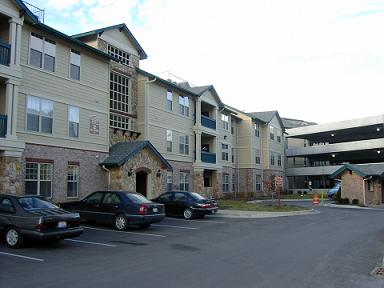 居間から見たキッチン & アパートの外観(奥が施錠する門付きの立駐)