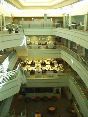 オフィス正面玄関 鴨いっぱい 内部の吹き抜け 我がデスク(赴任初日のため整理前)