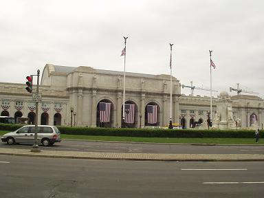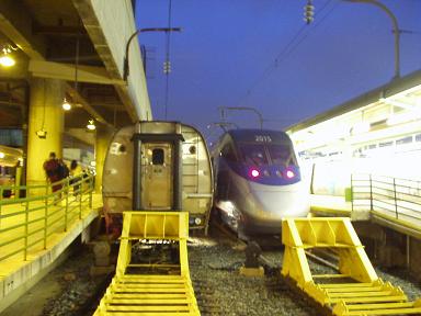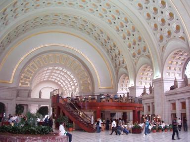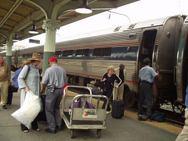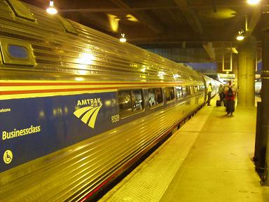 早朝で人気のない駅の待合、アメリカの列車と言えばアムトラック