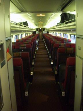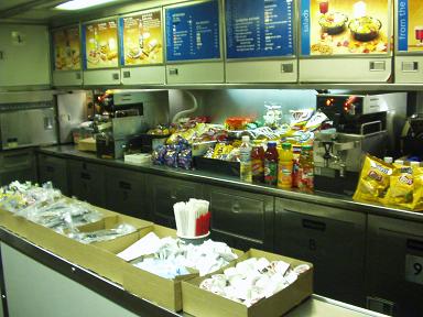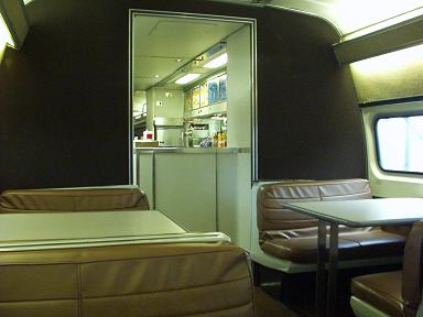 社内の様子、カフェテリア車、売店(売り子がいない・・・)