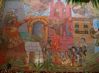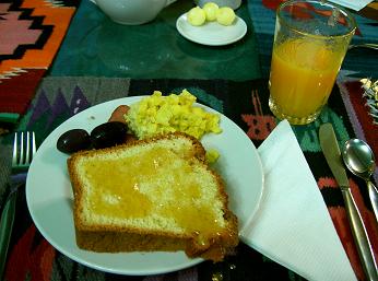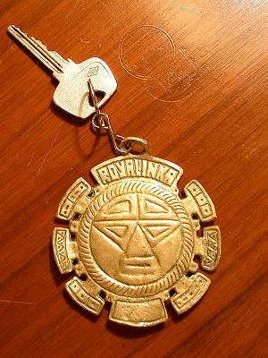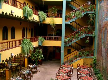 ホテルの吹き抜け、壁画、鍵もインカ風、朝ご飯