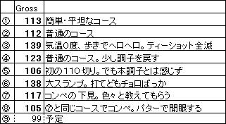 これまで雨で切り上げたものを除いて8回ラウンドした。これまでのスコアの変遷は下記の通り。