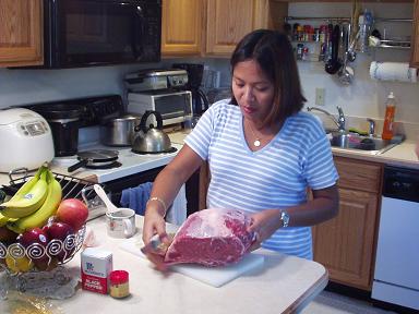 ルールかどうかはわかりませんが、今回は、肉をスライスする方向に対し、