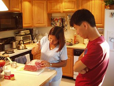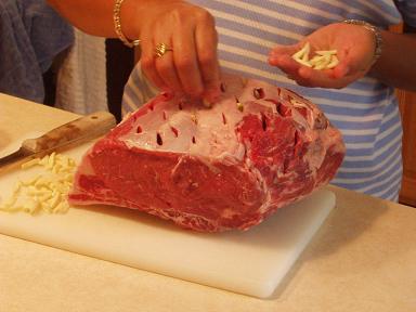 包丁で切った切り目に、にんにくを刺していきます。